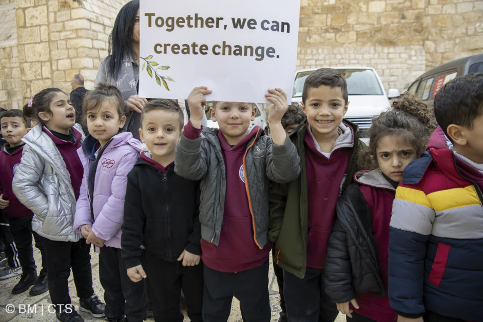 L'arrivée du Custode a été accueillie par les enfants des écoles catholiques de Bethléem avec une grande joie. Sur les bords de la route, jusqu'à la Place de la Mangeoire, leurs visages rayonnants et leurs pancartes appelant à la paix ont créé une atmosphère d'espérance.