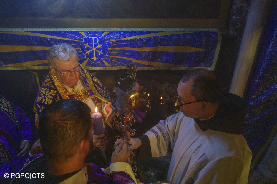 Dans l'après-midi, la récitation des Premières Vêpres a marqué le début officiel du Temps de l'Avent. À la fin de la célébration, le Custode, accompagné des frères et des fidèles, a participé à la procession jusqu'à la Grotte de la Nativité, cœur de la foi chrétienne. Il y a porté en procession la relique du Saint Berceau de l'Enfant Jésus, offerte par le Pape François à la Custodie de Terre Sainte. Après avoir rendu hommage à l'autel des Mages et à la Crèche, le Custode a allumé la première bougie de la couronne de l'Avent.