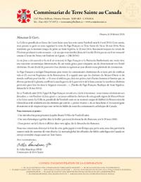 La Collecte pontificale en faveur des Lieux Saints aura lieu cette année Vendredi saint le 3 avril 2015. Nous posons ce geste cette année en nous rappelant la visite du Pape François en Terre sainte le 25 mai 2014. Nous retenons les paroles de l’Écriture qui ont marqué sa prière au Saint Sépulcre : « Je sais que vous cherchez Jésus, le Crucifié. Il n’est pas ici, car il est ressuscité comme il l’avait dit. Venez voir l’endroit où il gisait. » (Mt 28,5-6)