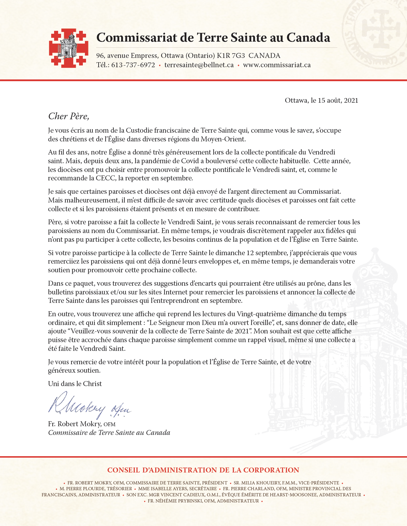 Le Commissariat canadien de Terre Sainte, au nom de nos sœurs et frères de Terre Sainte, tient à remercier les nombreuses personnes de notre Église canadienne qui ont déjà donné généreusement, ainsi que celles qui le feront le dimanche 12 septembre.