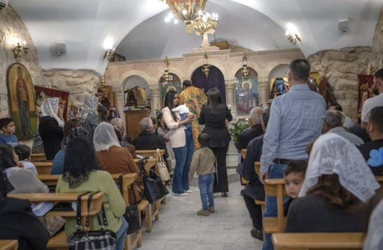 C’est dimanche, et les bancs de l’église débordent. La jeune Rafeef a rejoint ses copines de classe. Il y a des grands-pères à la moustache soignée, de jeunes parents venus présenter leur bébé à l’église pour la première fois, des copains qui chahutent doucement à l’étage, des jeunes femmes qui discutent à l’extérieur, des bambins qui gambadent... Moment de socialisation autant que de prière, les messes dominicales de Zababdeh sont le reflet de la vitalité de sa communauté chrétienne. Et de son atypisme.